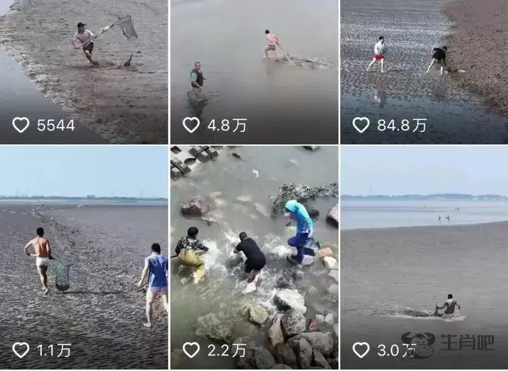 这些“抢潮头鱼”的视频,虽然加上了“抢潮头鱼危险,请勿模仿”,“不熟悉水性,没有弄潮经验的人,请勿尝试”等字样,但大多数视频配乐欢快,展现的都是满满渔获的画面。