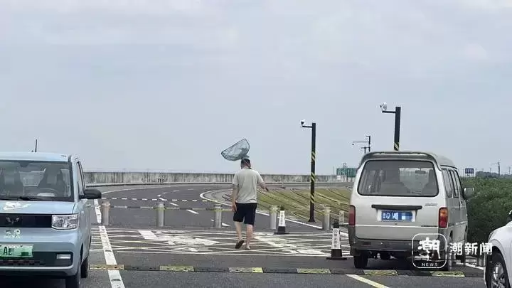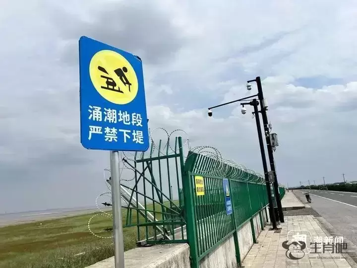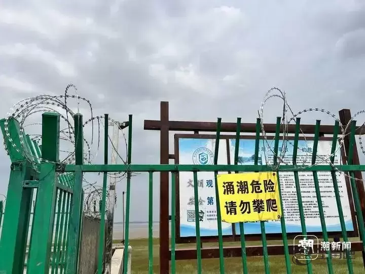 一处警示牌下,栏杆上方的铁丝围网被剪开,抢潮头鱼的人从这处缺口翻越进入江堤。“这些铁丝围网,只要破了我们就重新加固。加固好没两三天,就被人剪开了。”周师傅说,喊潮员的管理时间是每天潮前一小时,潮后两小时。为了管理“抢潮头鱼”,他们甚至潮前一个半小时就到了现场。“但抢鱼人比我们更早来,前两天高温,三十七八度的高温下,为了抢鱼,在滩涂上晒两个多小时。”