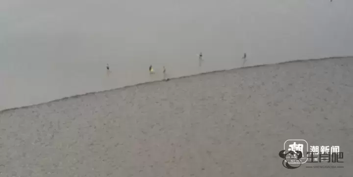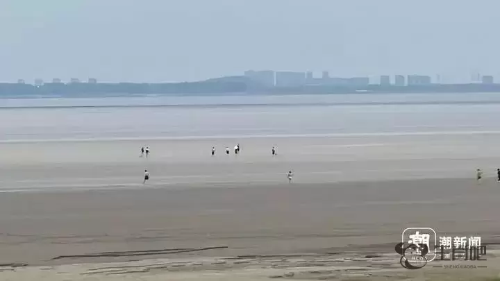 记者粗数了一下,有超过一百人在江堤滩涂之下。这些人中,不少到了滩涂的深处,有人已经到了距离江堤超过1公里的位置。