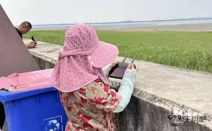 “就是在这里抢鱼的。”一名操作无人机拍摄的人说,他朋友就在滩涂上等着抢潮头鱼。