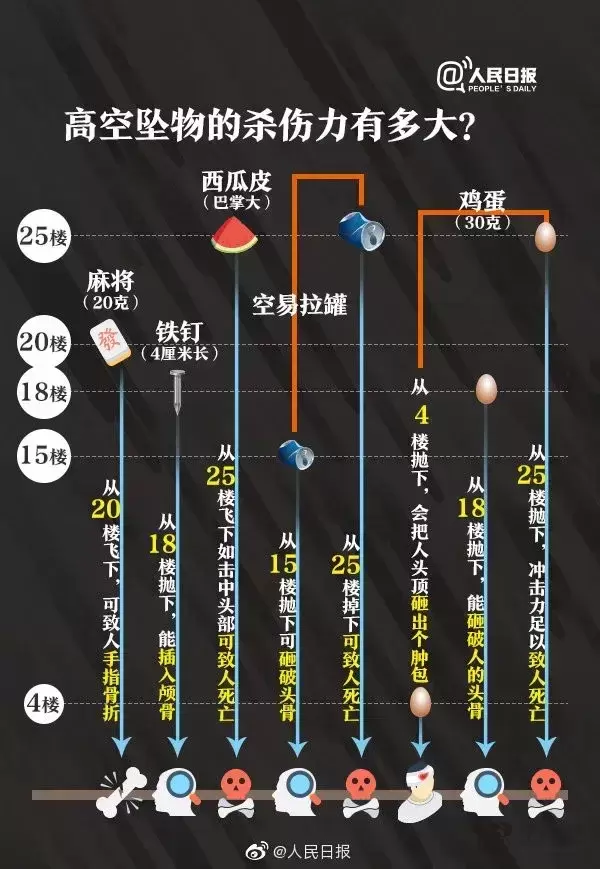 据专业实验测算,一枚重30克的鸡蛋,从18楼抛下,能砸破人的头骨。而从25楼抛下,冲击力足以致人死亡!