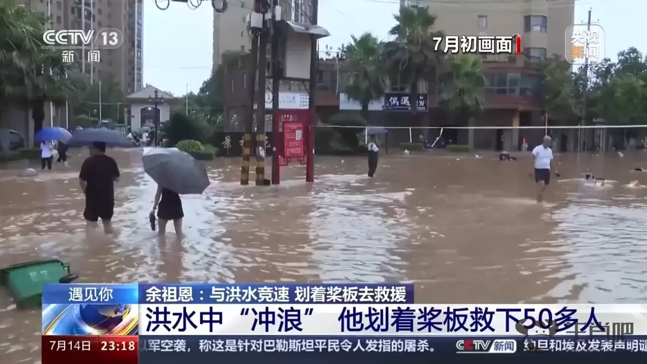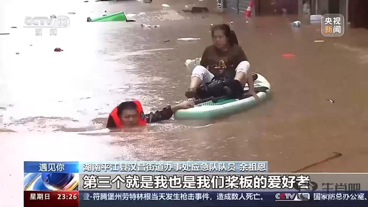 湖南平江县汉昌街道办事处应急队队员 余祖恩:当时我一跳下去以后,我本来是准备踩到底拖着过去的。我踮着脚还踩不到底,所以说我没有办法了,我只能游泳。于是我就采取托着桨板游泳的方式,拉着桨板,转移群众。