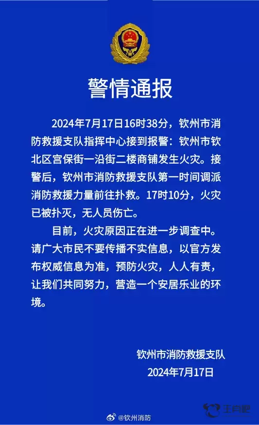 【警情通报】2024年7月17日16时38分,钦州市消防救援支队指挥中心接到报警:钦州市钦北区宫保街一沿街二楼商铺发生火灾。接警后,钦州市消防救援支队第一时间调派消防救援力量前往扑救。17时10分,火灾已被扑灭,无人员伤亡。