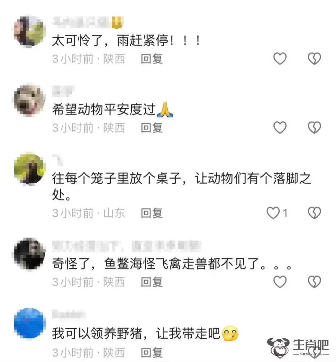 网友纷纷评论希望动物平安。“太可怜了,雨赶紧停”,“希望动物平安度过”。