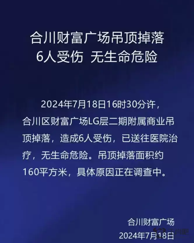据合川财富广场通报,7月18日16时30分许,合川区财富广场LG层二期附属商业吊顶掉落,造成6人受伤,已送往医院治疗,无生命危险。吊顶掉落面积约160平方米,具体原因正在调查中。