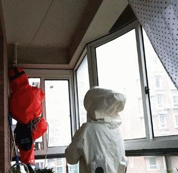 但是厚重的防蜂服并不影响吴建香的动作,转眼间他就爬上了阳台,兜着蛇皮袋给马蜂窝套上。蜂群受到惊扰,嗡嗡声更大了,不停有马蜂从窝里飞出来。