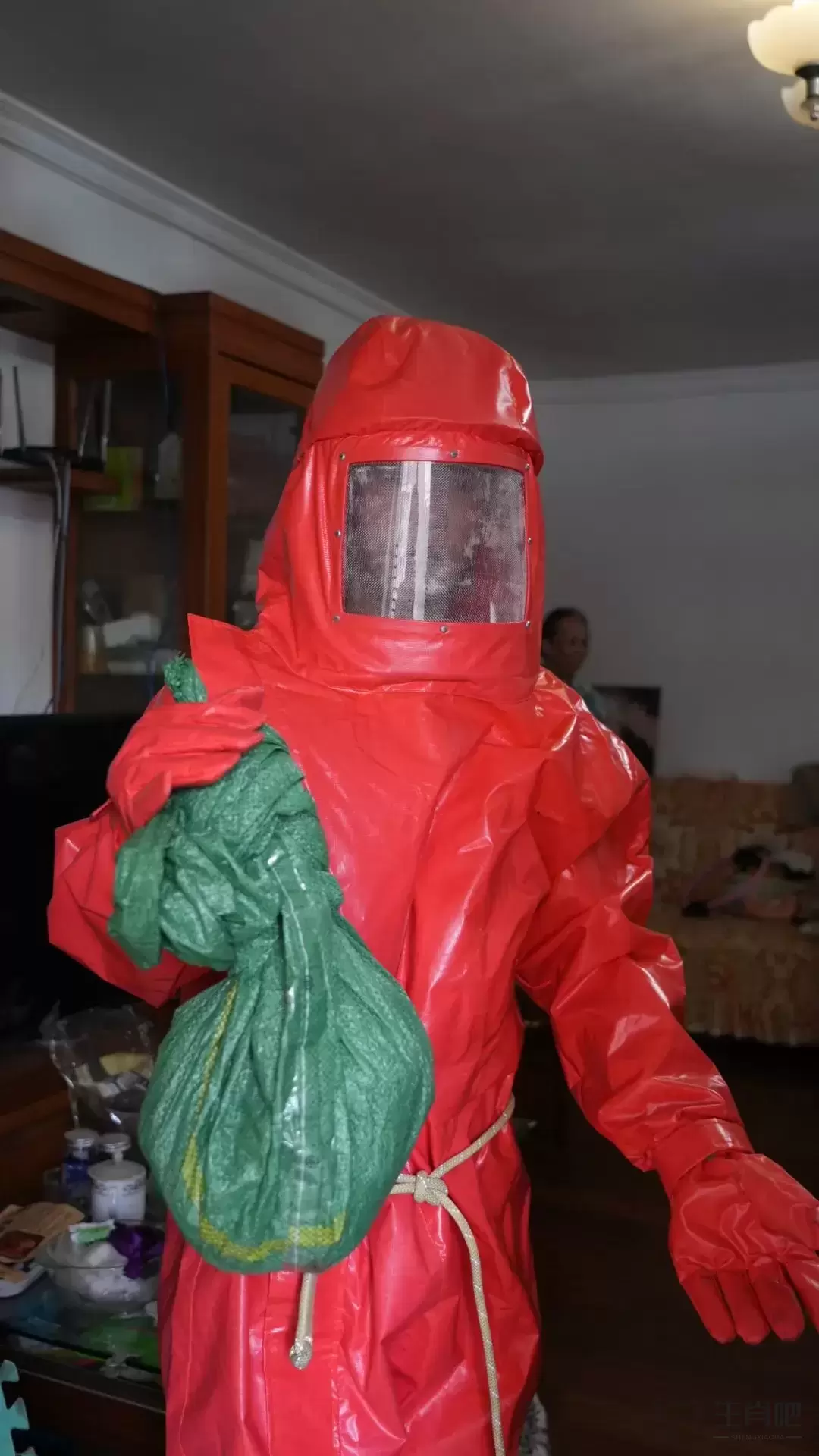 衣服整体很厚,手套、鞋子部分也是和服装连在一起的。面罩部分有细密结实的金属网,就像家里的纱窗,但丝毫不影响视线。