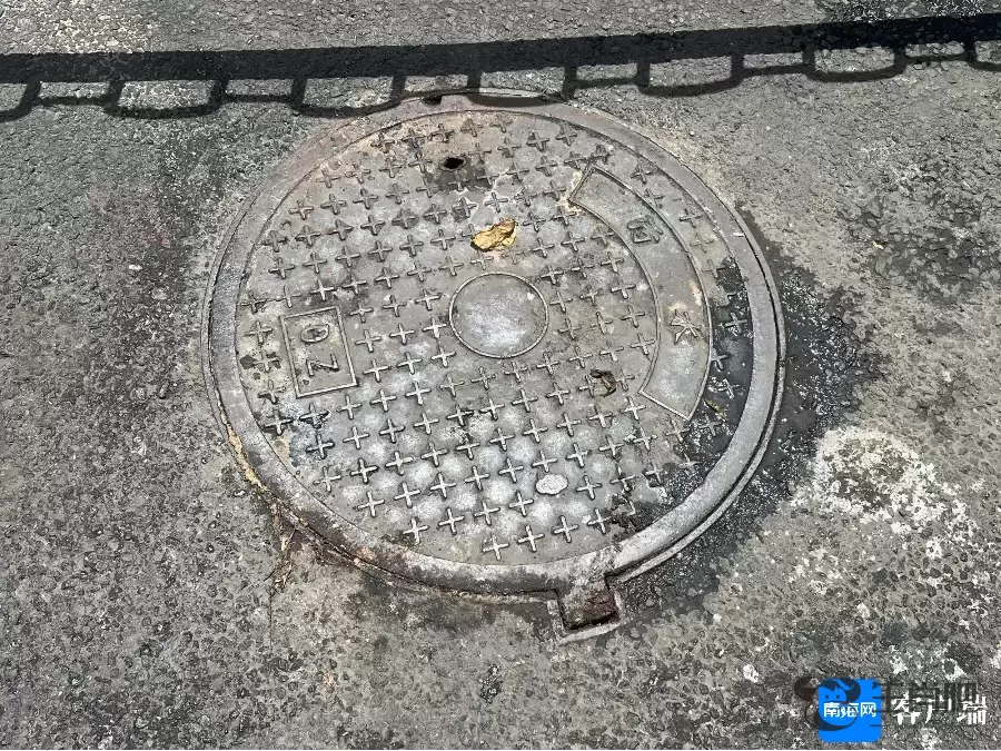 为什么骑行道上会出现这么多油?记者在现场看到,在该路段有三四个井盖,其中一个圆形井盖周边有油垢,另一个镂空方形井盖下面,可以看到污水面上有一层明显的油垢,在现场,记者能闻到很大的油垢的味道。