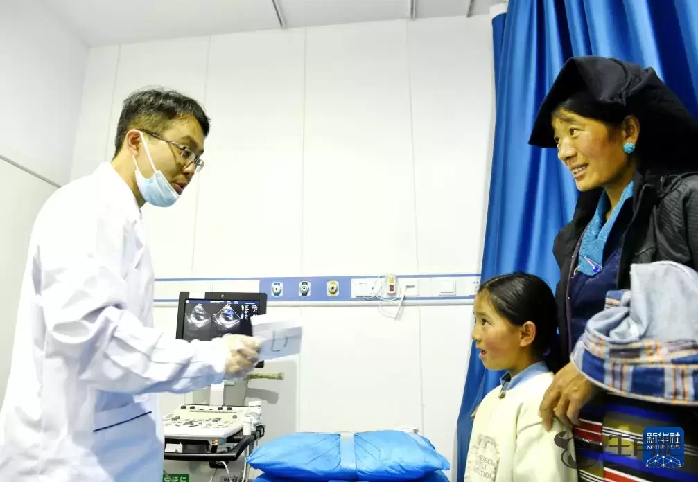 7月23日,南京医科大学附属儿童医院心胸外科主任戚继荣(左)在墨竹工卡县为儿童体检。 新华社记者 张汝锋 摄