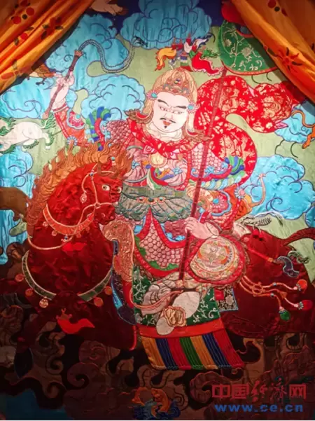 图为罗布堆绣唐卡作品《格萨尔王》局部。 中国经济网记者 魏金金/摄