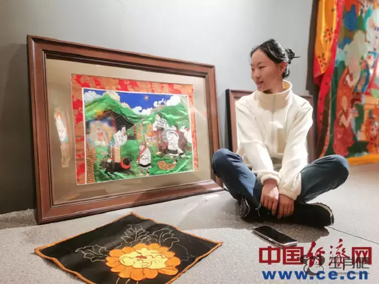 图为巴桑德吉和她的《羌塘牧区图》堆绣装饰画。 中国经济网记者魏金金/摄