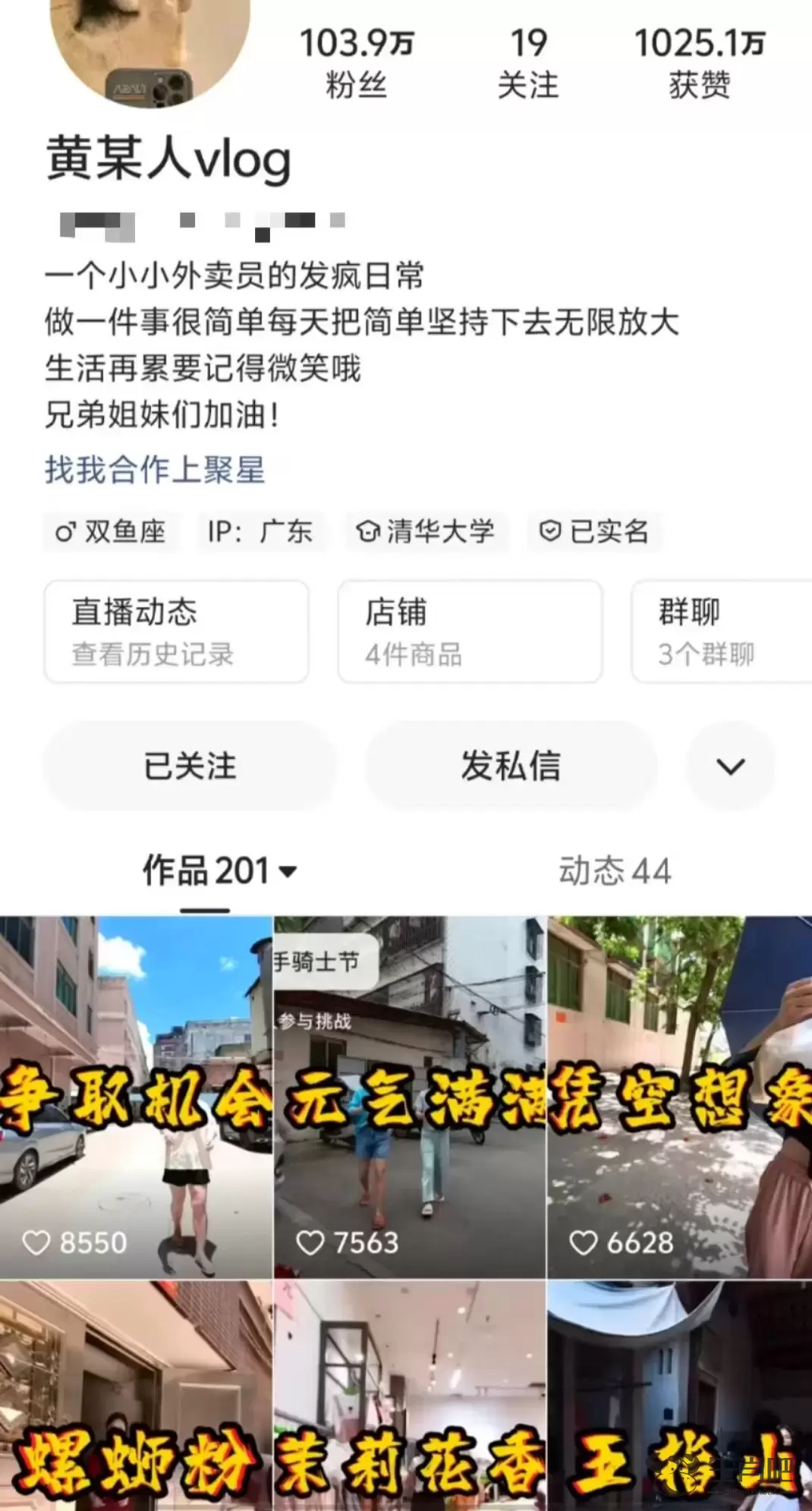 “黄某人vlog”已拥有超百万粉丝,在简介中自称是外卖员,近3个月里几乎每天都有直播。