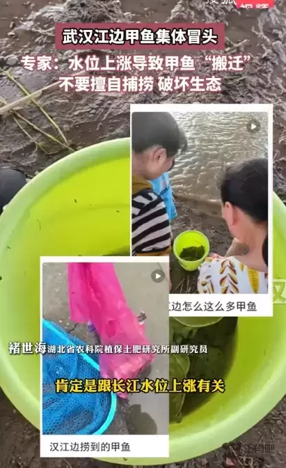 “也不排除有人工放生的可能,但如果是数量比较多的话,很可能是人工养殖的甲鱼逃逸了。”他说,长江水位上涨会引起很多生物栖息环境的变化,和平时有所区别。