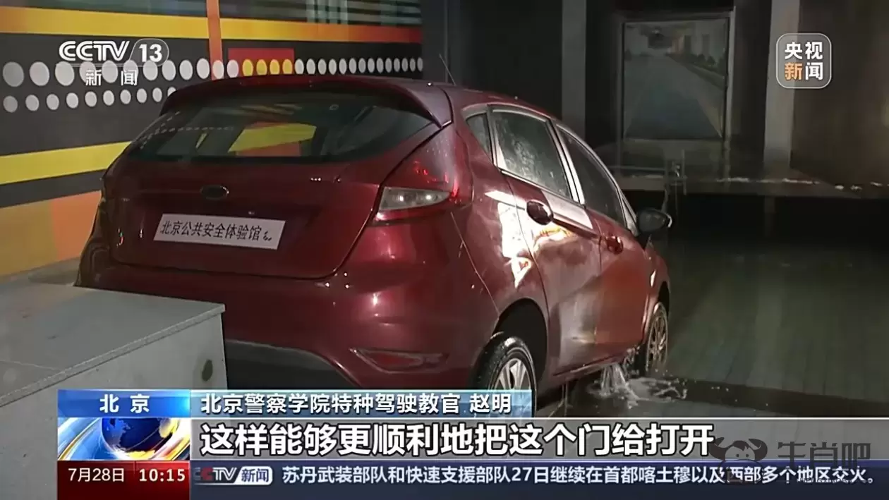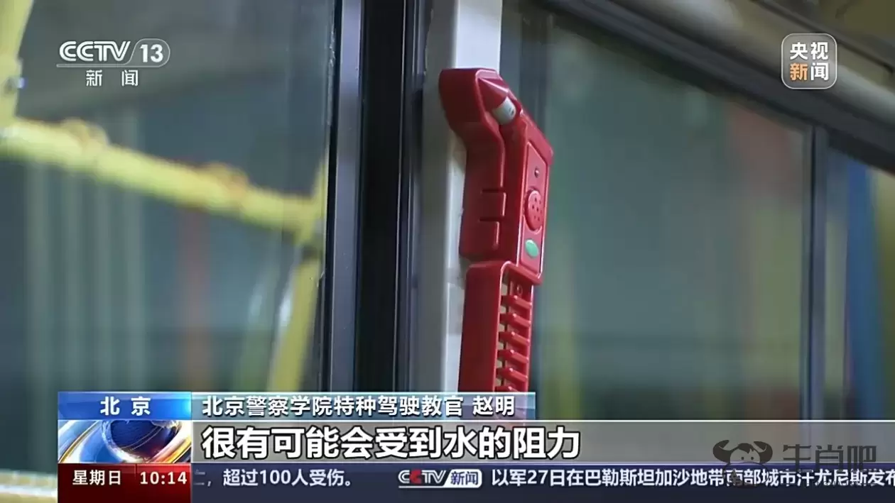 北京警察学院特种驾驶教官 赵明:在车辆内部进水的情况下,由于水的阻力,我们很难去推开这个门。很多人都觉得打不开、推不开门,这个门坏了,但其实不是,是因为水。车厢内部的压强和外边水压不均衡,才造成车门打不开。所以建议这种情况下,尽可能地让水的内部压强和外部压强基本上接近,这会儿用肩膀顶门,能够更顺利地把门打开。