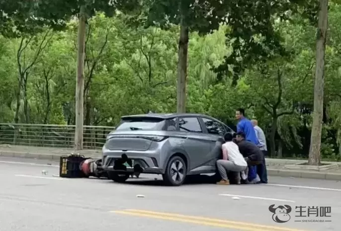 在该段视频里可以看到,一辆灰色电动轿车底部有一个外卖员,车头部位是一辆歪倒的电瓶车,看到有人被困车里,立即有三、四个人冲了过去,开始抬车,但由于车辆较重,效果不是很明显,于是又有一个热心人搬来了一个凳子试图垫高车身。