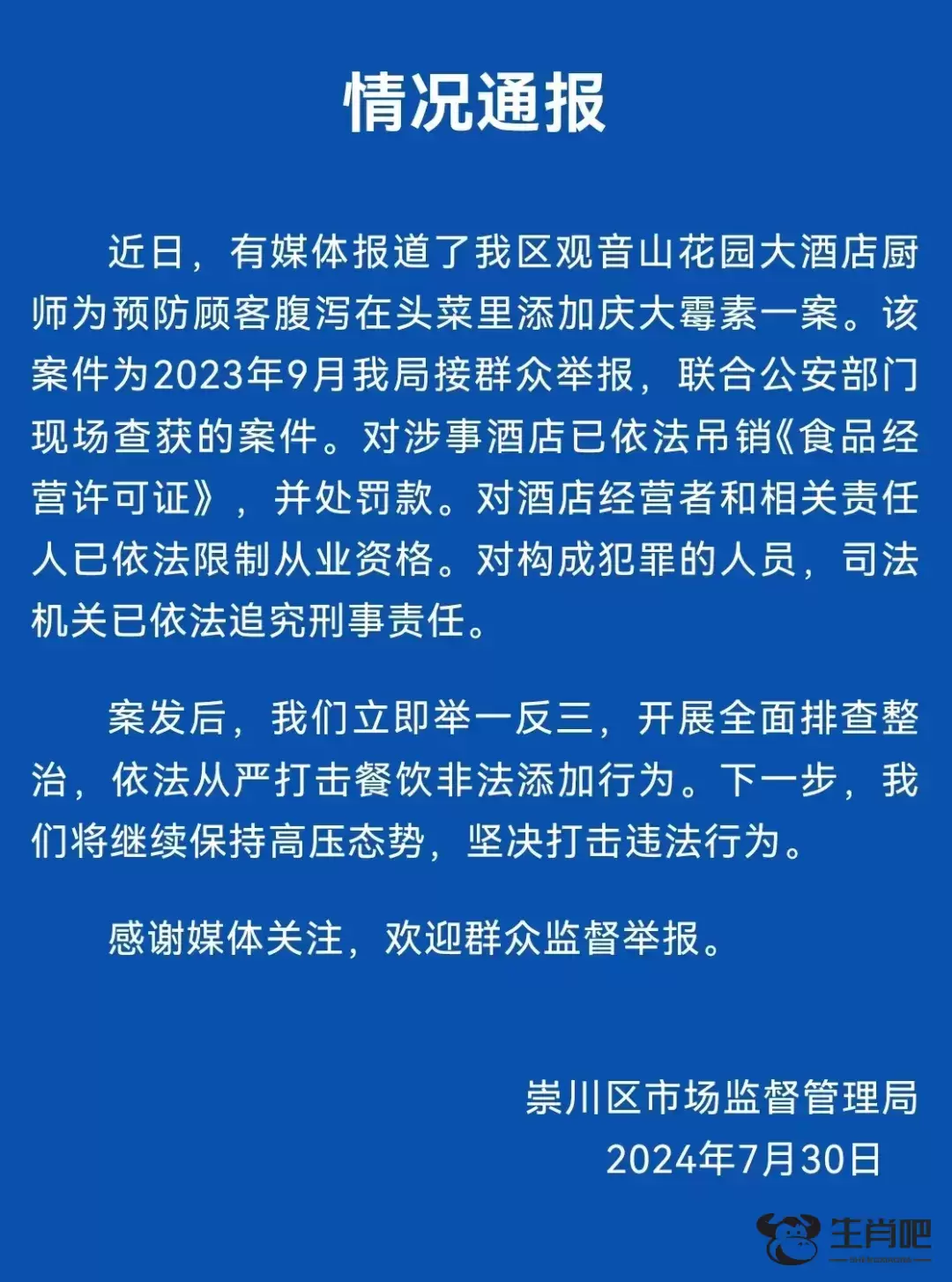 近日,有媒体报道了江苏南通崇川区观音山花园大酒店厨师为预防顾客腹泻在头菜里添加庆大霉素一案。今天(30日),崇川区市场监督管理局发布情况通报,该案件为2023年9月崇川区市场监督管理局接群众举报,联合公安部门现场查获的案件。对涉事酒店已依法吊销《食品经营许可证》,并处罚款。对酒店经营者和相关责任人已依法限制从业资格。对构成犯罪的人员,司法机关已依法追究刑事责任。