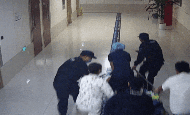 为了抢得黄金救治时间,参与运送患者的安保人员奔跑速度飞快,从门诊到急救室仅花了1分钟不到的时间。由于要保持正规的频率和力度,加之过程中有多个转弯,还要避让其他人员,在床上埋头按压的胡晓青感觉“很晕,很难平衡”:“他们一边拉床还要一边挡住我的身体,不然我要被甩出去的。”