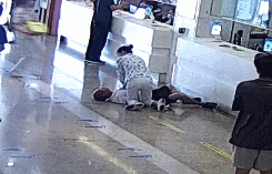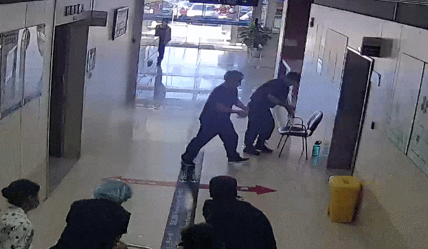 当天上午,一名大伯在医院大厅窗口缴费时突然倒地,工作人员迅速呼救。紧接着,一场生死急救上演。