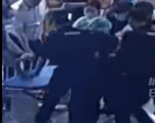 9点29分,众人接力抢救,合力将患者抬上抢救床,急诊护士胡晓青一跃而上,一路为患者按压,直至患者推入急诊抢救室。