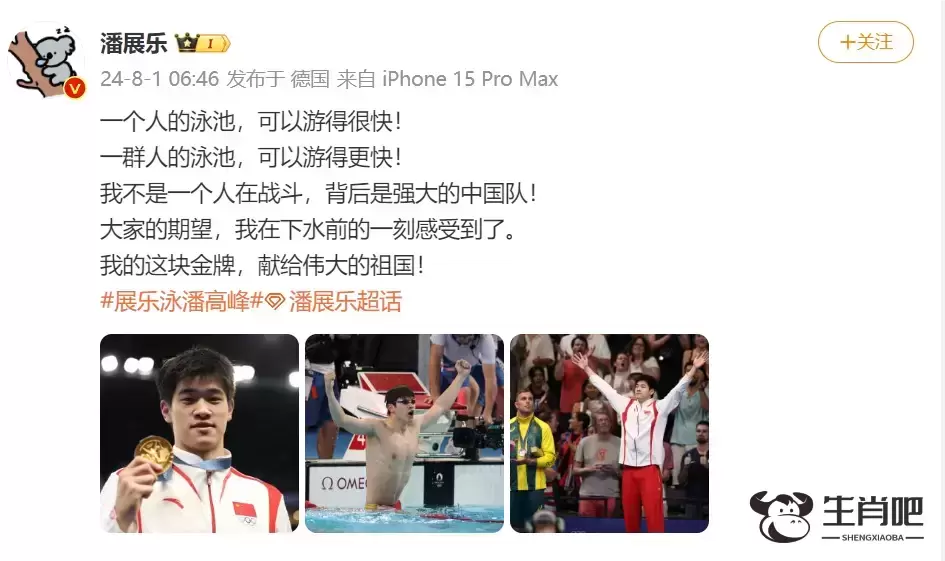 据央视体育,7月31日,在巴黎奥运会男子100米自由泳决赛中,中国选手潘展乐游出46秒40,打破世界纪录,夺得金牌。