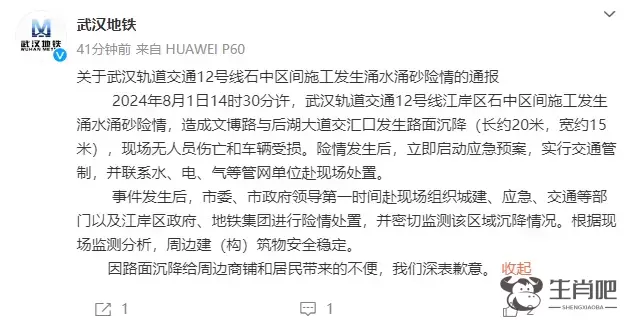 据央视新闻报道,武汉地铁集团刚刚对此事作出回应,2024年8月1日14时30分许,武汉轨道交通12号线江岸区石中区间施工发生涌水涌砂险情,造成文博路与后湖大道交汇口发生路面沉降(长约20米,宽约15米),现场无人员伤亡和车辆受损。
