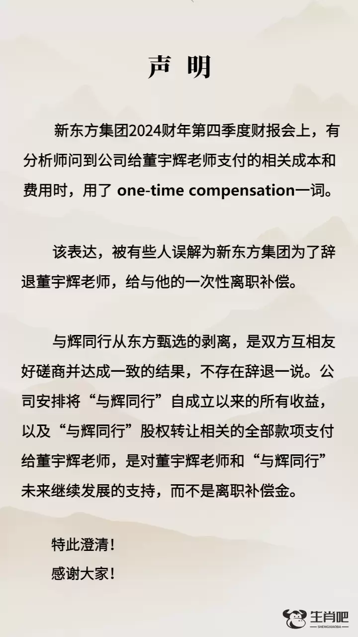 新东方发声明:不存在辞退董宇辉一说,否认“离职补偿金”说法 2024 年 8 月 2 日 下午12:00 • 新闻快报 • 阅读 4 不存在辞退董宇辉一说,否认“离职补偿金”说法 新东方发布声明: 原创文章,作者:admin,如若转载,请注明出处:https://mip.shengxiaoba.com/news/43021.html 一说发声明否认声明新东方离职董宇辉补偿金辞退 0 奶茶控别错过!上周五洛杉矶开了第一家喜茶 上一篇 2024 年 8 月 2 日 上午11:26 砂里淘金代表指什么生肖,精选解答落实 下一篇 2024 年 8 月 2 日 下午12:31 相关推荐 吴艳妮巴黎奥运首秀小组第6进复活赛,赛后采访称“给自己打0分” 2024 年 8 月 7 日 谨防热射病发生,这些知识需要了解 2024 年 7 月 21 日 浙江杭州:汉代精品玉器荟萃良渚古城 2024 年 12 月 20 日 小伙在婚恋公司相亲遇婚骗,“红娘”让女方“吊着”有钱人骗彩礼 2024 年 9 月 7 日 高铁推出儿童套餐,网友:适合大龄儿童吗? 2024 年 7 月 11 日 西安一驾驶员车辆起步观察不周撞倒七旬老人致其死亡,交警介入 2024 年 8 月 14 日 抢劫、杀人、抛尸……黑龙江警方破获一起23年前命案 2024 年 7 月 17 日 【央广时评】落实立德树人根本任务 做新时代“大先生” 2024 年 9 月 10 日 高温汛期,工贸企业安全提示! 2024 年 8 月 5 日 开车时差点窒息!起因居然是后备箱里的一箱冷饮…… 2024 年 9 月 1 日