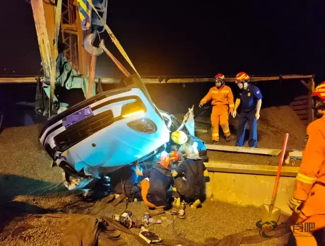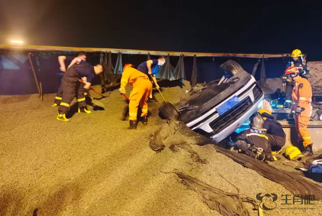 消防救援人员到场后发现,现场是一辆满载100多吨的砂石半挂车与一辆小型轿车发生事故,半挂车车身侧翻并把小轿车压在路中央的隔离墩上,半挂车出现漏油现象,小轿车180度翻转,大量石子将小轿车后部埋压,小轿车变形严重,车内有两名大人一名不到三岁的小孩被困,特别是后排座被困人员空间极为狭小,被困人员情绪失控不停地发出哭喊求救声,同时伴随缺氧情况,情况紧急。