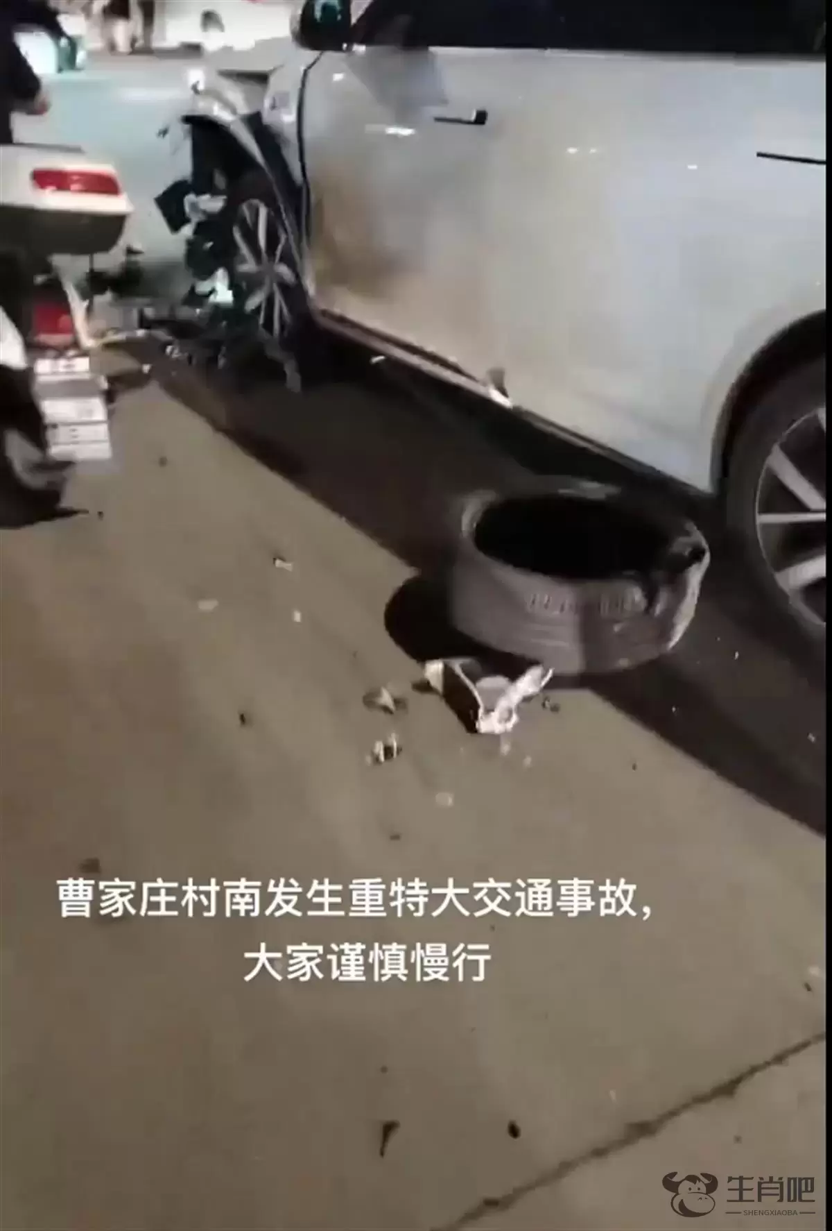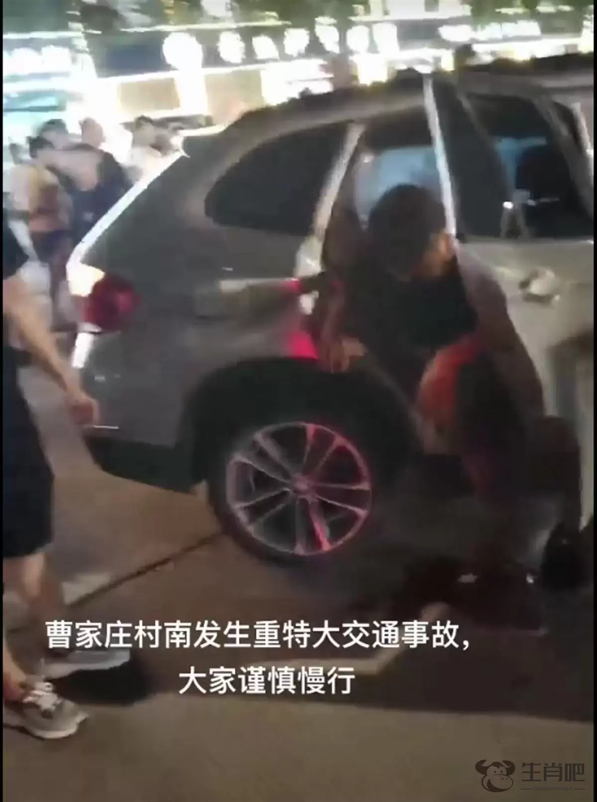 网络视频显示,一起交通事故的现场,一辆宝马SUV的副驾驶座位上坐着一名男子,安全气囊已经弹出,后排座位上的一名男子受了伤,靠在车门上。附近不远处一辆白色SUV车前部受损,地面散落着大量零部件和一个轮胎。
