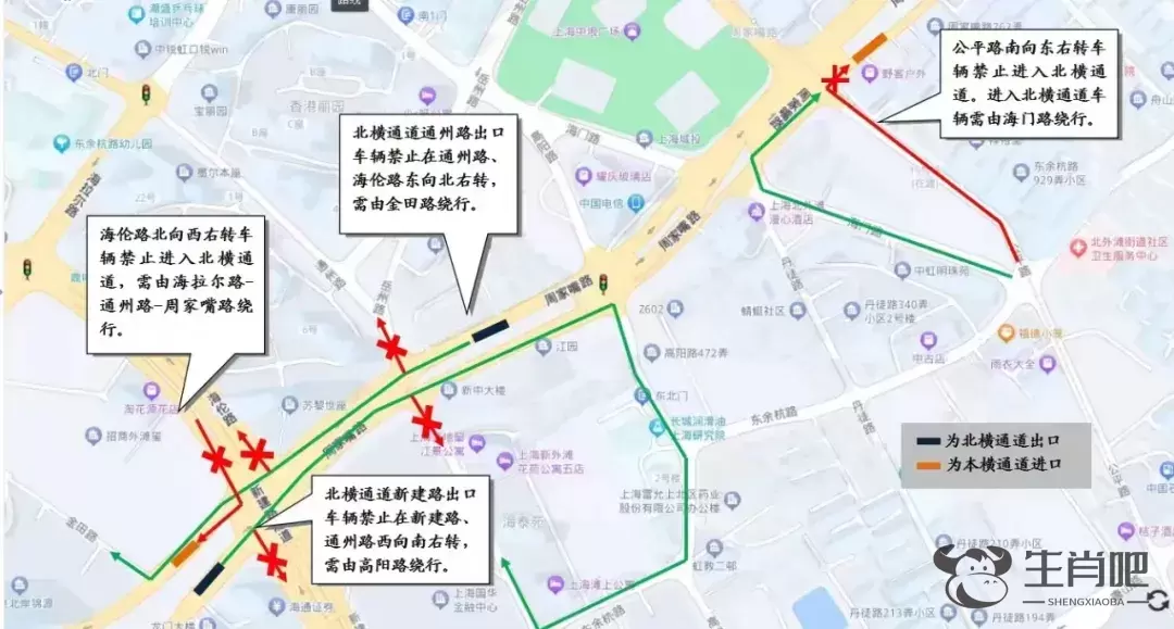 三是公平路南向东车辆禁止右转进入北横通道,需由海门路、周家嘴路绕行。