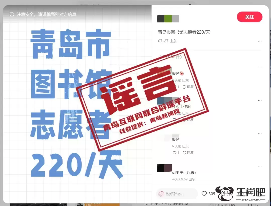在小红书平台上,有网民发布信息称“青岛市图书馆招志愿者,220元/天”,评论区中有大批网民对此很感兴趣,想要报名参与。记者在网络上搜索得知,类似这样的“图书馆有偿兼职(志愿者)”信息在全国许多地方均有发布,但绝大多数都是骗局。诈骗分子以“图书馆有偿志愿者”作为诱饵,引得求职者上钩,之后诈骗分子会要求求职者交纳“中介费”“介绍费”等名目不同的费用,以此骗取求职者钱财。