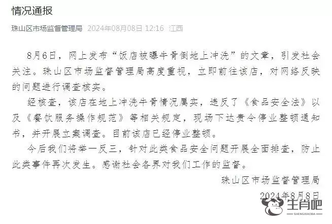 8月6日,网上发布“饭店被曝牛骨倒地上冲洗”的文章,引发社会关注。珠山区市场监督管理局高度重视,立即前往该店,对网络反映的问题进行调查核实。