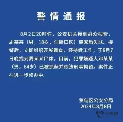 8月8日14时45分,武汉市公安局蔡甸区分局针对“18岁高三学生失联”事件发布警情通报,称失联学生周某某尸体已于7日晚找到。目前,犯罪嫌疑人邓某某(男,64岁)已被抓获并依法刑事拘留。案件正在进一步侦办中。