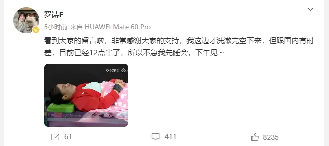 随后,她也更新了自己的社交媒体,并配上了自己在比赛间隙睡觉的照片。并写道“看到大家的留言啦,非常感谢大家的支持,我这边才洗漱完空下来,但跟国内有时差,目前已经12点半了,所以不急我先睡会,下午见~ ”