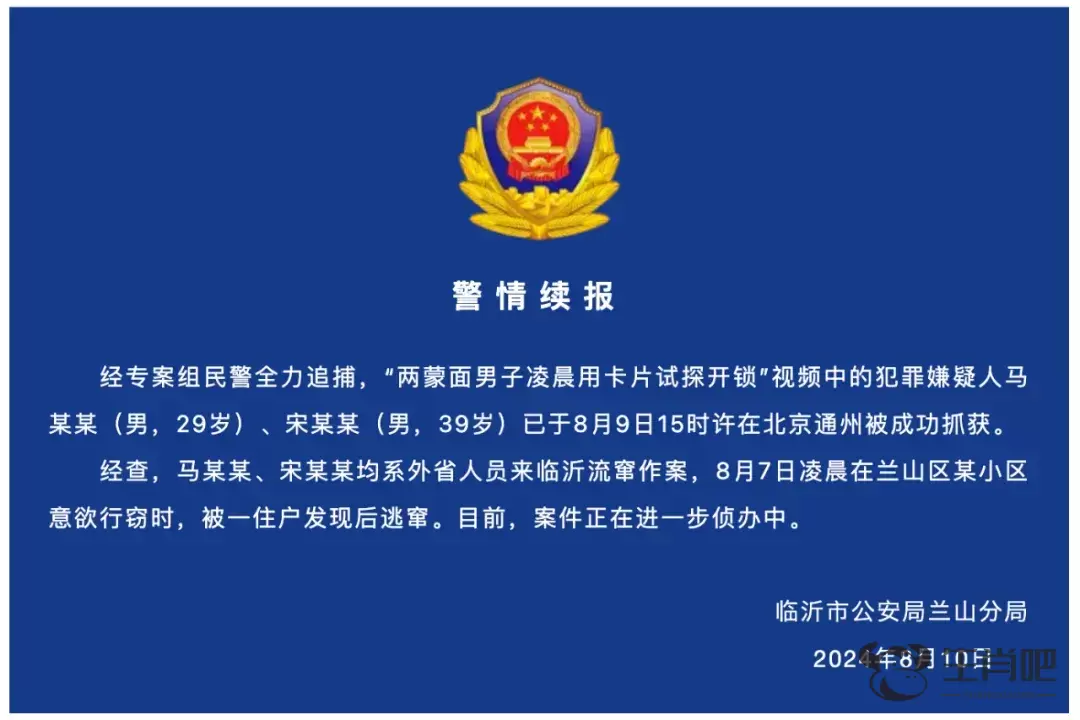 8月10日,兰山公安官微发布警情续报,犯罪嫌疑人已在北京被抓获,系外省人员来临沂流窜作案。