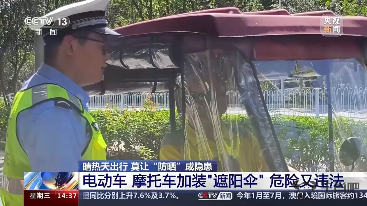 从夏季开始,不少电动车和摩托车驾驶人会陆续给自己的车辆加置装备,以起到“防晒”或“遮雨”的作用。这些遮阳篷样式多样,有伸缩式的,也有固定式的,骑行人员在出行的时候既能遮阳又能挡雨,看似非常方便。但交警表示,无论是哪种样式的遮阳伞,这都属于车辆改装的违法行为。
