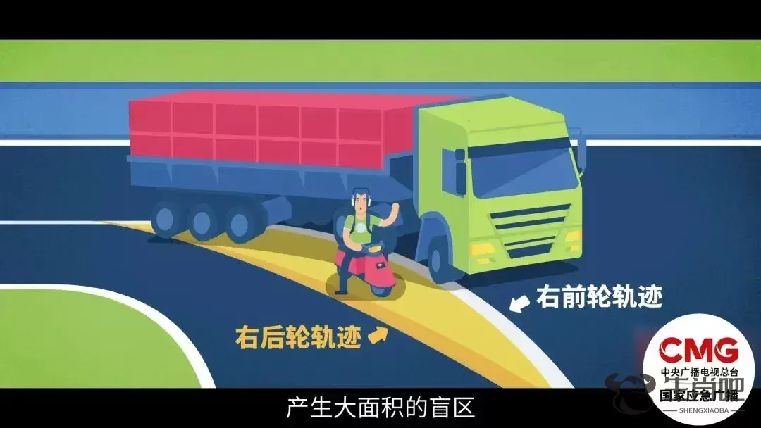 大型车辆转弯时,前、后车轮的运动轨迹不重合,会呈现出弯月形状的盲区。若此时处在这一区域,极易被刮倒、卷入车底,发生碾压事故。