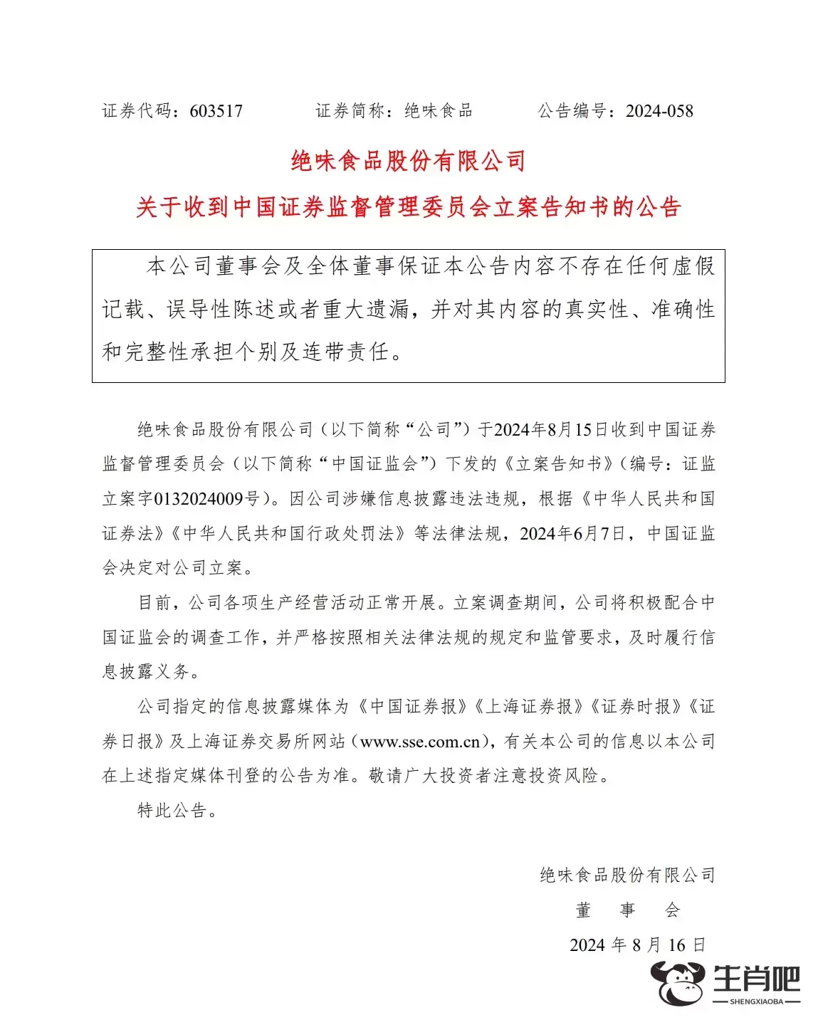 绝味食品8月15日公告,公司于8月15日收到中国证监会下发的《立案告知书》。因公司涉嫌信息披露违法违规,根据《中华人民共和国证券法》《中华人民共和国行政处罚法》等法律法规,6月7日,中国证监会决定对公司立案。目前,公司各项生产经营活动正常开展。