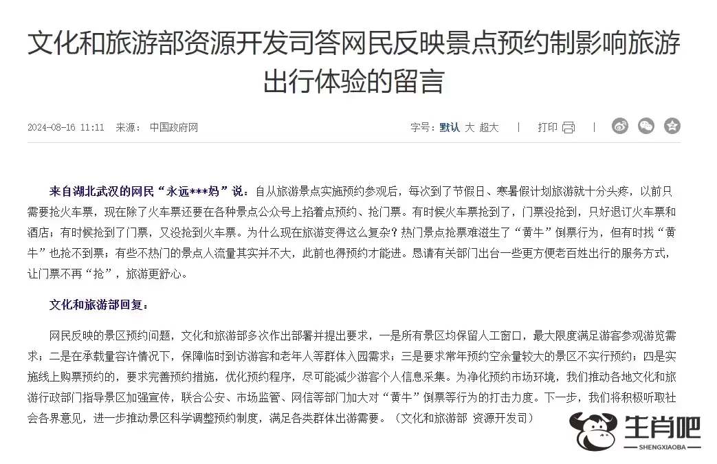对此,文化和旅游部资源开发司8月16日在中国政府网上答复:网民反映的景区预约问题,文化和旅游部多次作出部署并提出要求,一是所有景区均保留人工窗口,最大限度满足游客参观游览需求;二是在承载量容许情况下,保障临时到访游客和老年人等群体入园需求;三是要求常年预约空余量较大的景区不实行预约;四是实施线上购票预约的,要求完善预约措施,优化预约程序,尽可能减少游客个人信息采集。