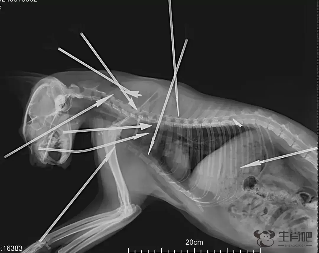 猫咪救助志愿者张女士提供的照片显示,狸白猫的头部、胸部和背部总共被射入9支箭,而根据X光片,还有一个断了的箭头留在猫咪体内,也就是说,狸白猫总共中了10箭。因伤势过重,最终这只猫咪抢救无效死亡。
