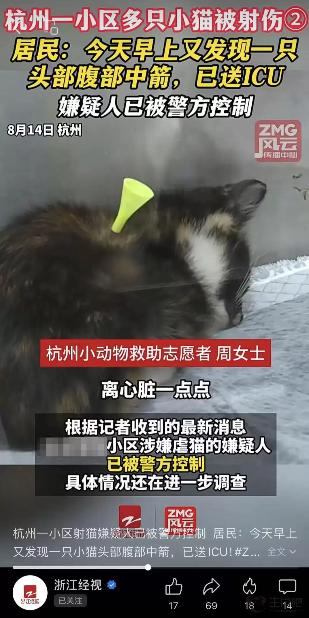 8月13日,杭州余杭区某小区居民发现,一只在小区生活了3年的猫被箭射伤,身上插着9支箭。