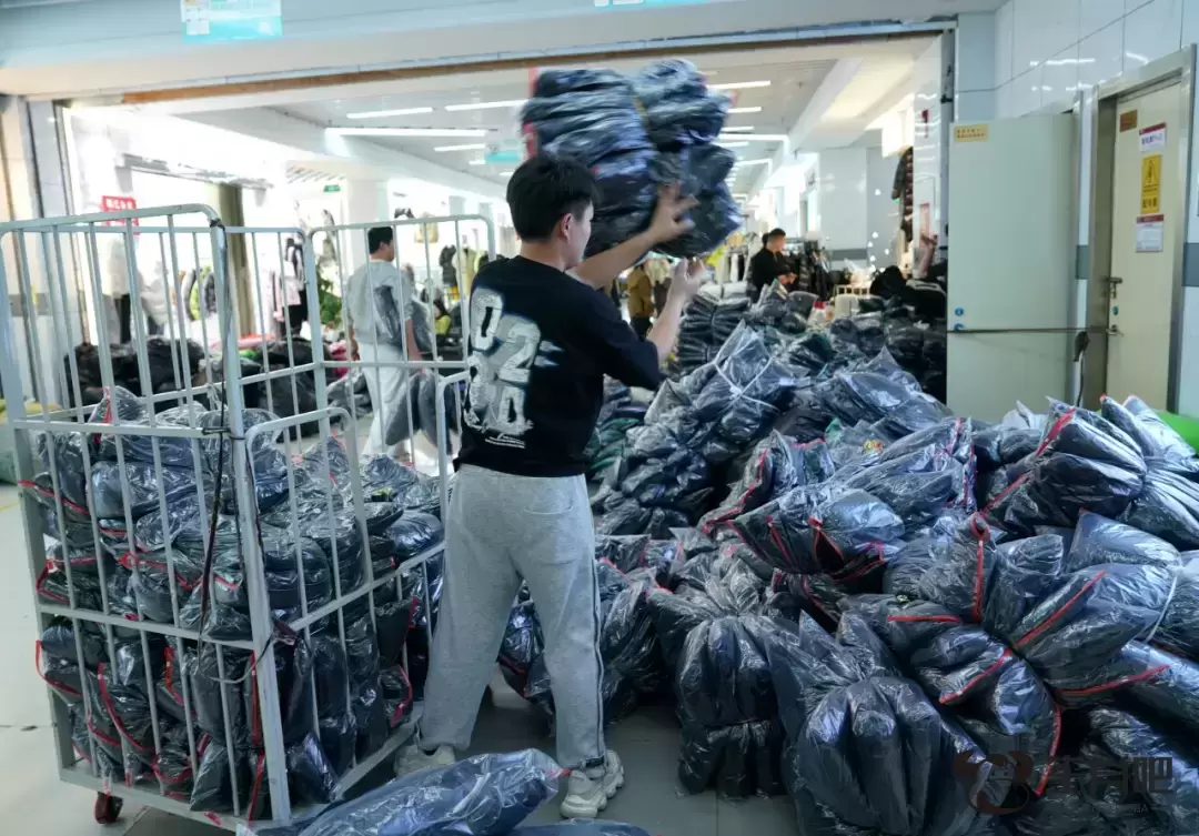 平湖·中国服装城的商户整理即将发货的羽绒服。韩传号摄(新华社)