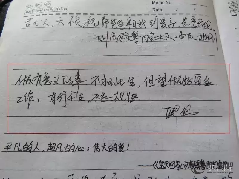 谈起寻亲经历,郭刚堂表示,“电影《失孤》只有一个多小时时长,确实都是根据我的真实经历改编,但只展现了寻亲经历的一部分。”郭刚堂介绍,有一次自己骑行寻亲的时候误闯高速,两位交警及时劝阻,并给他留言。“当时两位民警不像电影里直接停在车子面前,而是超过了200米左右后朝我招手,也没有对我进行处罚或是批评,只是看了看摩托车后面寻亲的旗子,告诉我摩托车不能上高速,而且车况也不好,便护送我下了高速。”郭刚堂拿出了自己寻亲时的笔记本,将交警的留言指给记者看。