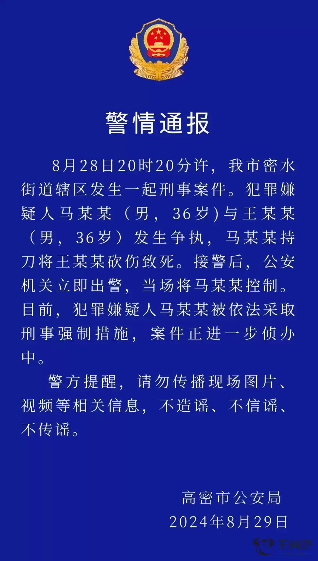 8月28日20时20分许,我市密水街道辖区发生一起刑事案件。犯罪嫌疑人马某某(男,36岁)与王某某(男36岁 )发生争执,马某某持刀将王某某砍伤致死。接警后,公安机关立即出警,当场将马某某控制。目前,犯罪嫌疑人马某某被依法采取刑事强制措施,案件正进一步侦办中。