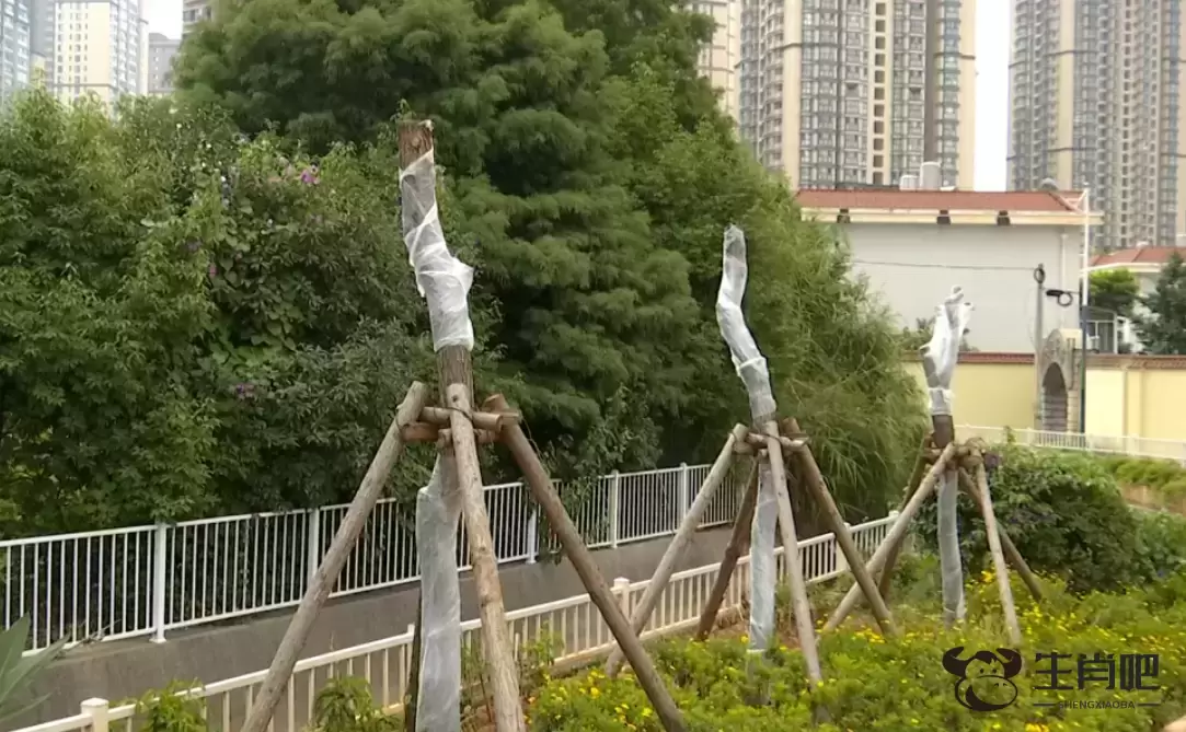 现场画面显示,金汁河畔的绿道游园旁,曾经挺立的一排树木如今只剩半截树干,切口包裹着白色网布。