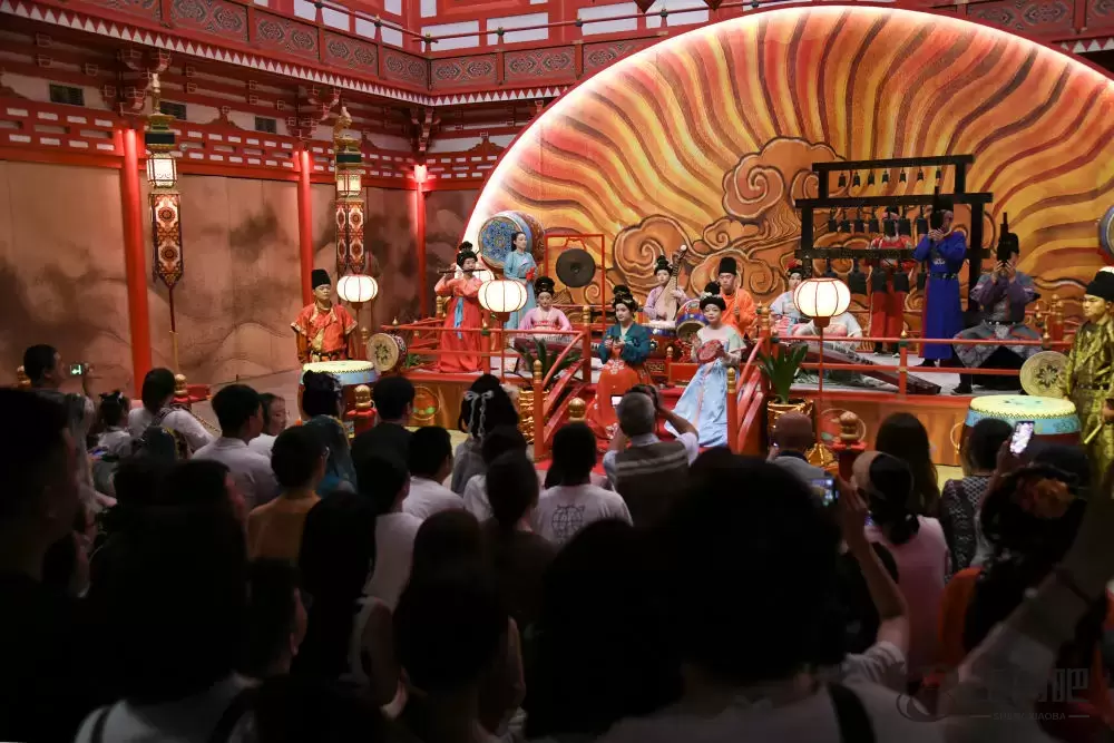 8月6日,游客在西安长安十二时辰主题街区内观看演出。新华社记者 张博文 摄