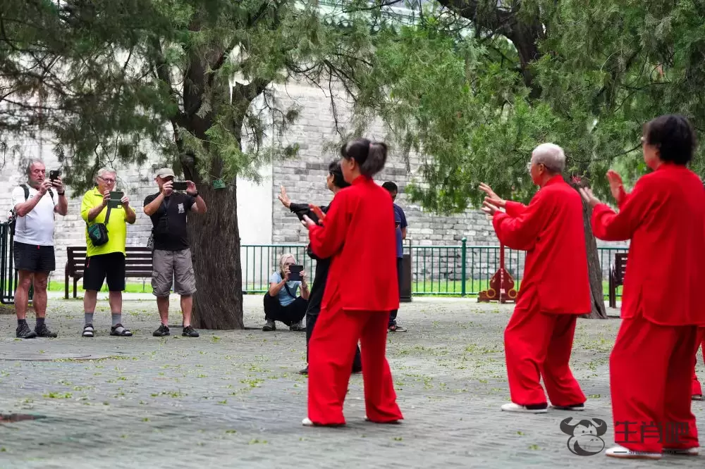 7月2日,在北京天坛公园,几位外国游客在观看太极拳。新华社记者 鞠焕宗 摄