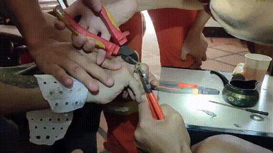 2023年9月3日,天津市两名学生到消防站求助,其中一男孩手指被戒指卡住,手指已经红肿。消防救援人员用“迷你小钳”小心拆剪,成功帮助男孩脱困。