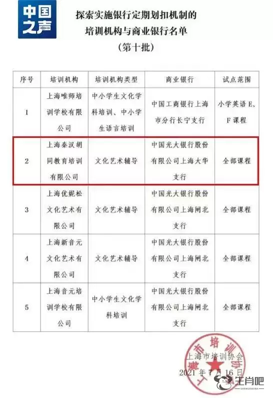 2021年,上海市培训协会公布了一份“探索实施银行定期划扣机制的培训机构与商业银行名单”,称“为切实维护消费者的合法权益,消费者预付的培训资金由商业银行直接收取、保管。银行按照与消费者及培训机构的合同约定,将培训资金定期划扣至培训机构,消费者可以按照合同约定,要求商业银行停止后续培训资金的划扣。”