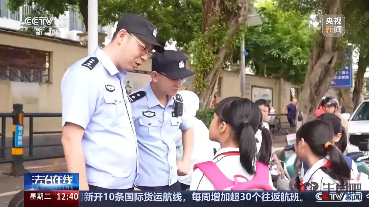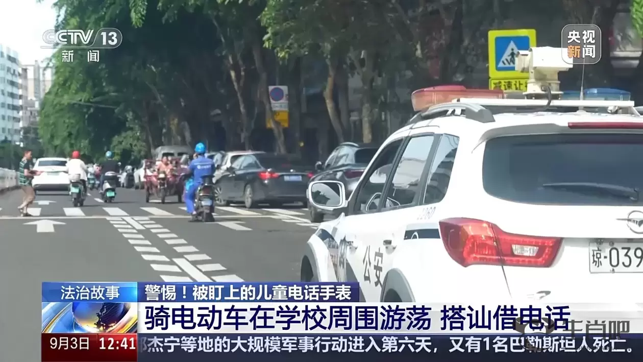 这是2024年6月,海南省海口市公安局琼山分局的民警根据家长报案内容调取的一段公共场所视频,案发地点在辖区内一所学校附近,只见一名穿着校服、手里拿着电话手表的小学生走着走着,突然被两个骑着电动自行车的大孩子叫了过去,说了几句话后,这名小学生就把电话手表递了出去。