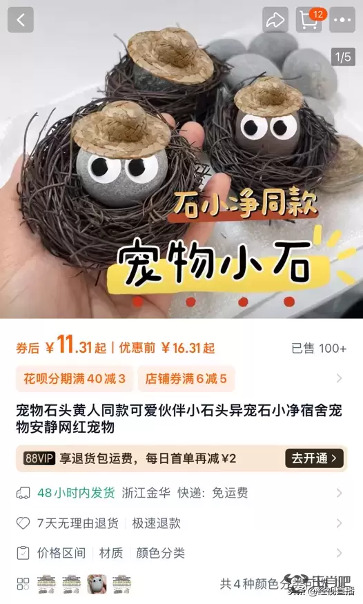 记者随机采访了一位石宠店主叶子,99年的她来自广东,从2023年7月开始在淘宝开店卖石头,起初是因为在看动画电影《小黄人大眼萌:神偷奶爸前传》时,看到奥托举起圆圆的宠物石头特别触动,于是萌生了自己卖石头的想法。在叶子的店里,卖得最好的是一款宠物石头套装——小石行李套装,里面包含了一块2-7厘米大小的石头、1张小石身份证、1本饲养手册、1顶草帽、1个草窝和若干表情贴纸,短短两个月已经销售1000多单,月收入过万元。